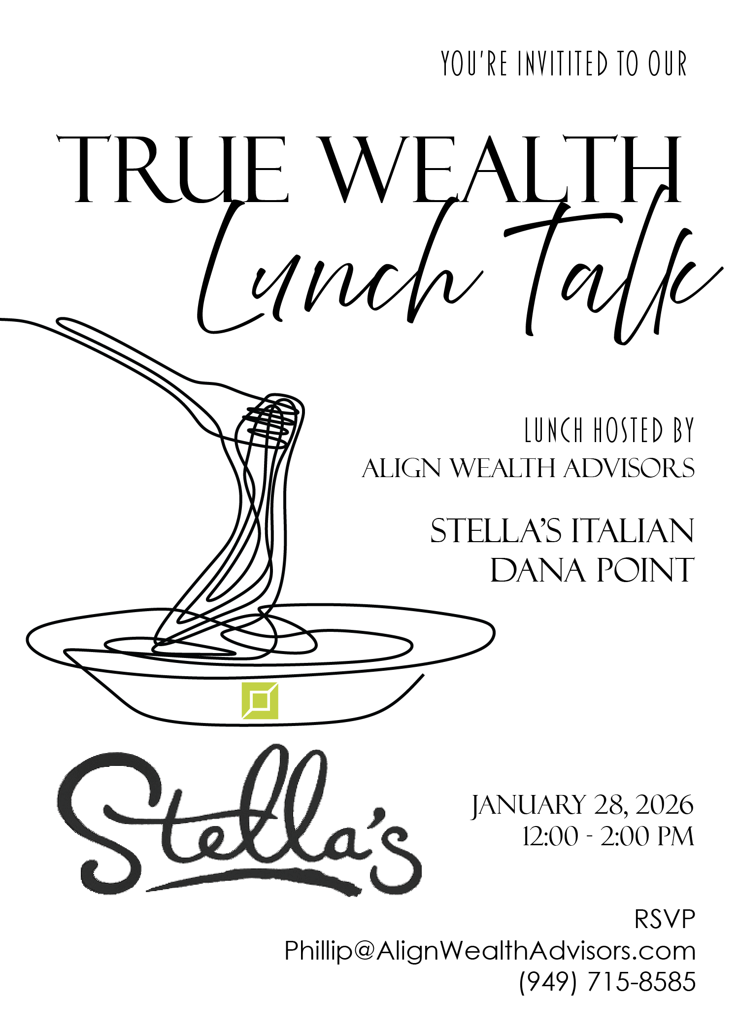 Join us for lunch JANUARY 29, 2026 @ 12PM for a conversation about Investor Success. We look forward to speaking with you about your investing goals and how best to achieve them to ensure a fun, stress-free retirement!